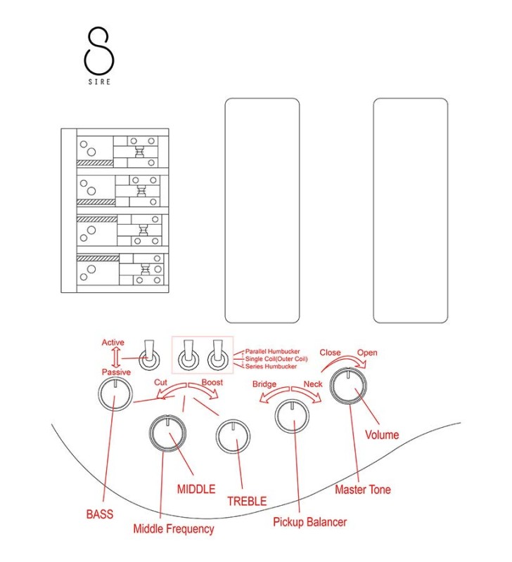 Regeling: Volume, passieve toon, blend, treble, middle, middle frequency, bass, pickup variation schakelaar