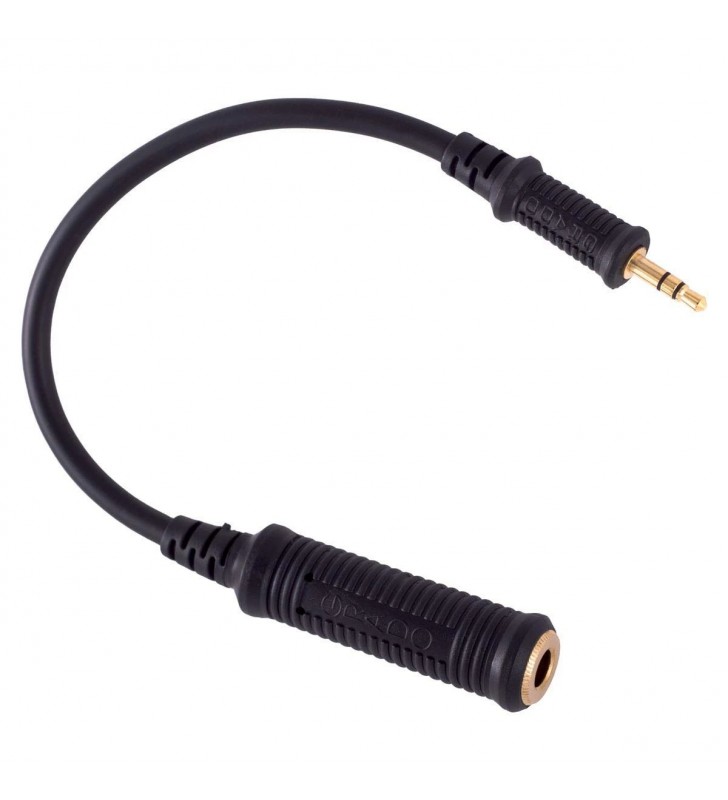 De mini-adapterkabel heeft een 1/8 inch (3,5 mm) male stereo jackplug en vervolgens een 8 inch (20 cm) kabel aangesloten op een 1/4 inch (6,3 mm) female jack.