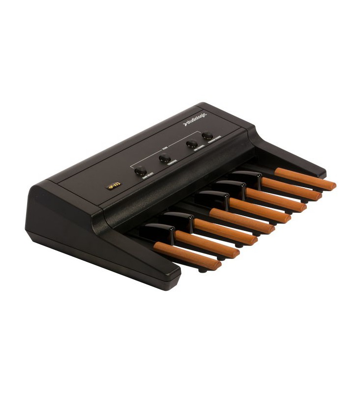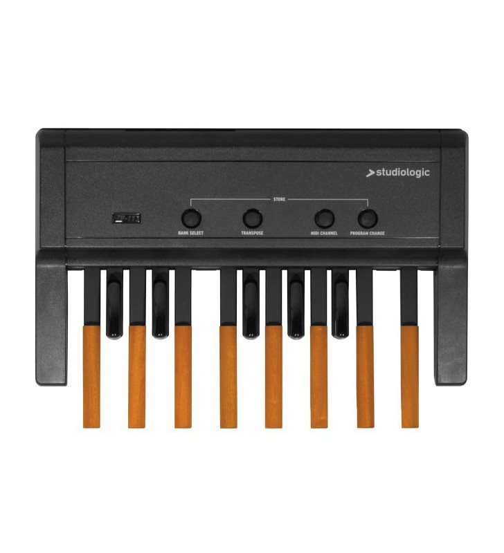 Het MP Pedalboard van studiologic is uitgerust met een overzichtelijk bedieningspaneel, waarmee het MIDI-kanaal, bank select, transpose en MIDI program change zijn in te stellen middels vier grote drukknoppen.
