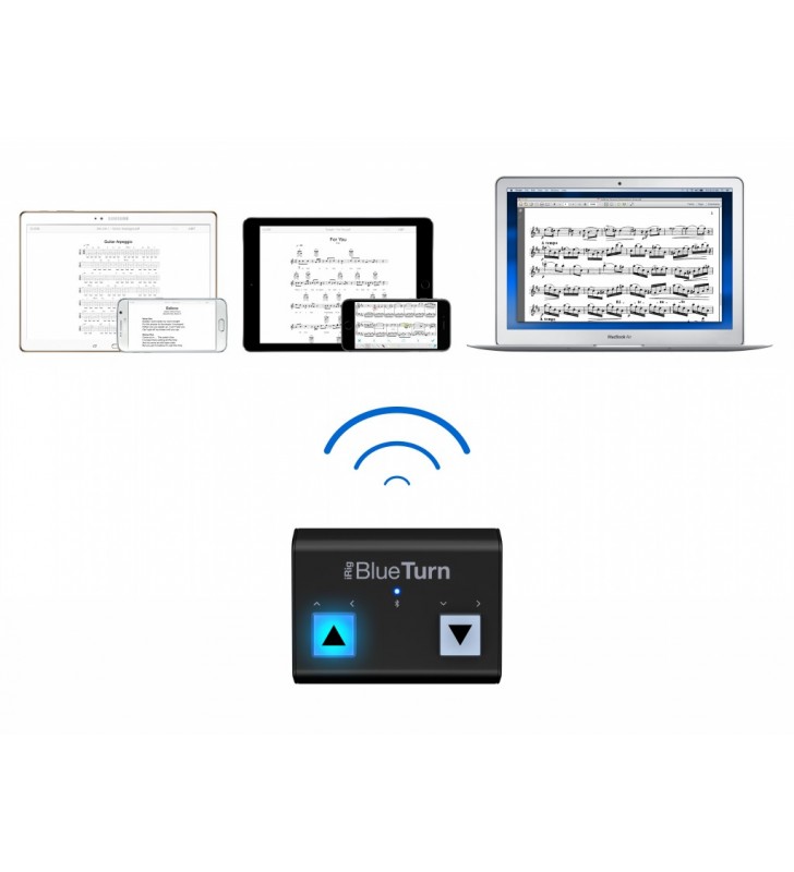 De iRig BlueTurn pedaal is een compacte oplossing voor het scrollen en omslaan van digitale pagina's voor iPhone / iPad, Mac en Android via Bluetooth.