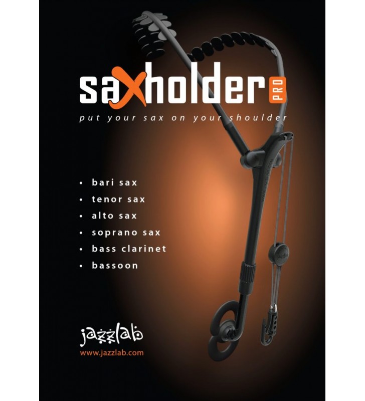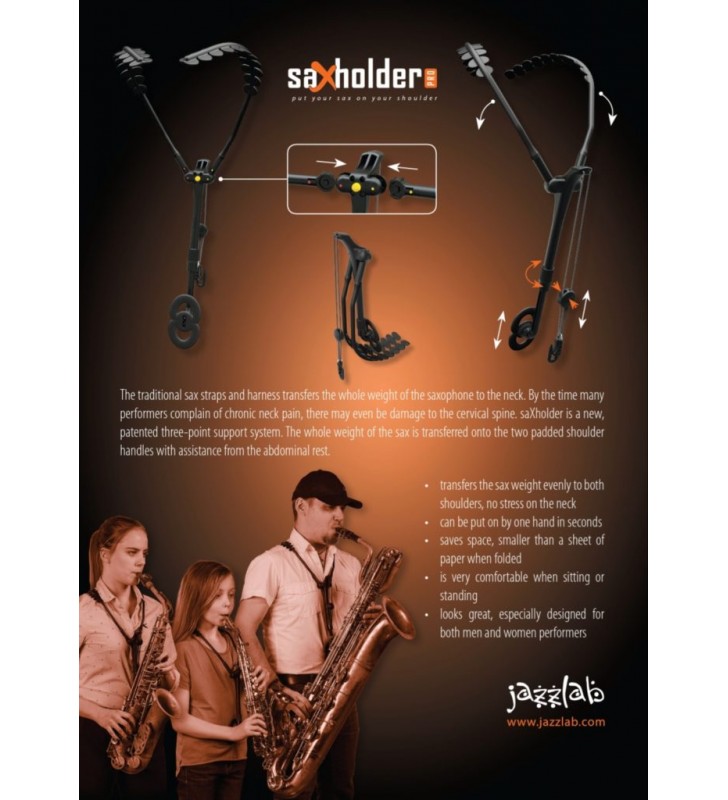 De traditionele saxband of sax-harnas brengt het hele gewicht van het instrument naar de nek. Tegen de tijd dat veel artiesten klagen over chronische nekpijn, kan er zelfs schade aan de wervelkolom zijn. SAXHOLDER-PRO is een nieuw, gepatenteerd driepunts ondersteuningssysteem. Het hele gewicht van de sax wordt met behulp van de buiksteun op de twee gevoerde schoudergrepen overgebracht.