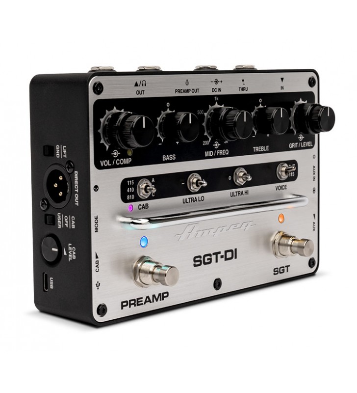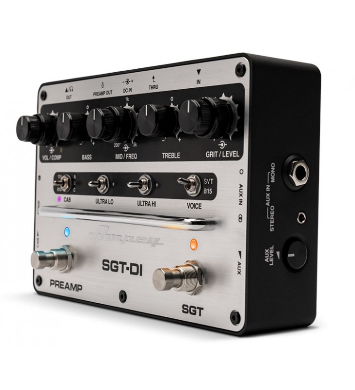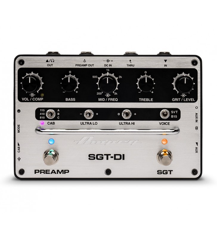 De SGT-DI® preamp en DI geven moderne bassisten een complete set in één stompbox. Het levert een verbeterd Super Grit Technology™ overdrive circuit met iconische Ampeg SVT® en B15 stemmen, veelzijdige 3-bands EQ nu met sweepable Mid circuit, Ultra-Hi en 3-weg Ultra-Lo schakelaars, een variabele compressor en een Aux/Headphone sectie. Plus! Introductie van de eerste IR Loader/Cab Simulator van Ampeg. Kies uit drie klassieke fabriekscabines of tot drie eigen cabines met behulp van de gratis Ampeg IR Loader applicatie.