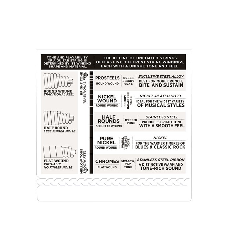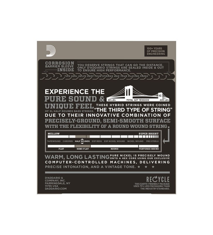 D'Addario Halfrounds zijn rond gewikkeld met roestvrij staal en vervolgens nauwkeurig geslepen waardoor het buitenoppervlak glad en "semi-plat" achterblijft. Het resultaat is een snaar met de toon- en spanningskarakteristieken van roundwound snaren, met een soepeler gevoel, vergelijkbaar met flat wound snaren.