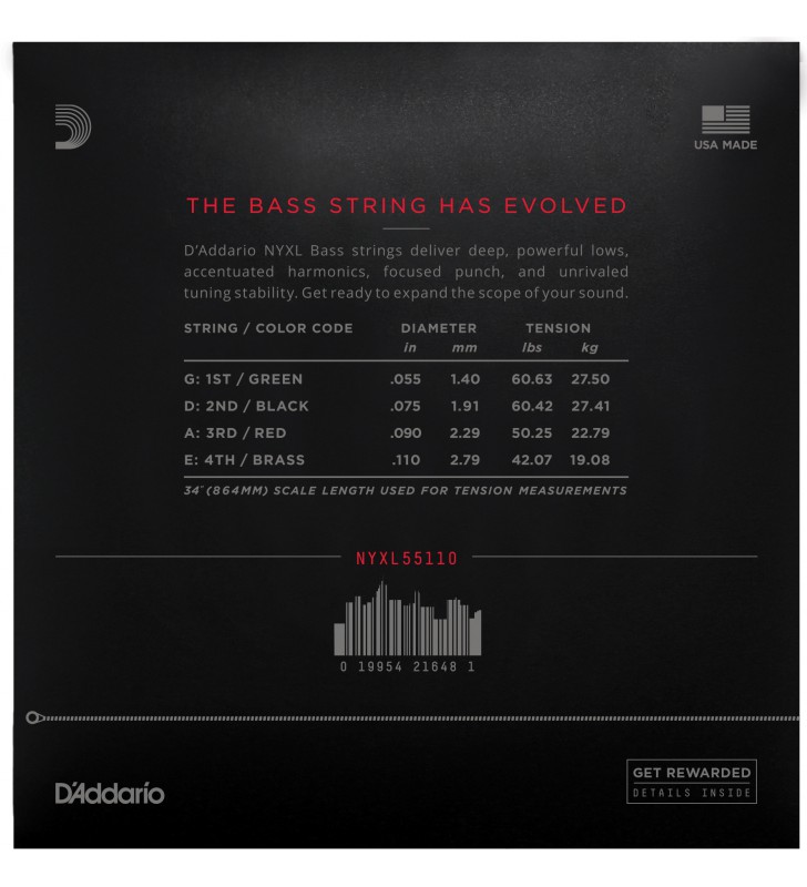 NYXL Bass is voorzien van onze NY Steel kern met een hoog koolstofgehalte, omwikkeld met ons geherformuleerde vernikkeld staen windingen. Deze nieuwe constructie levert diep, krachtige laag, en geaccentueerde boventonen. Ontworpen voor alle speelstijlen, biedt NYXL Bass meer dynamisch bereik en sustain dan elke andere bassnaar.