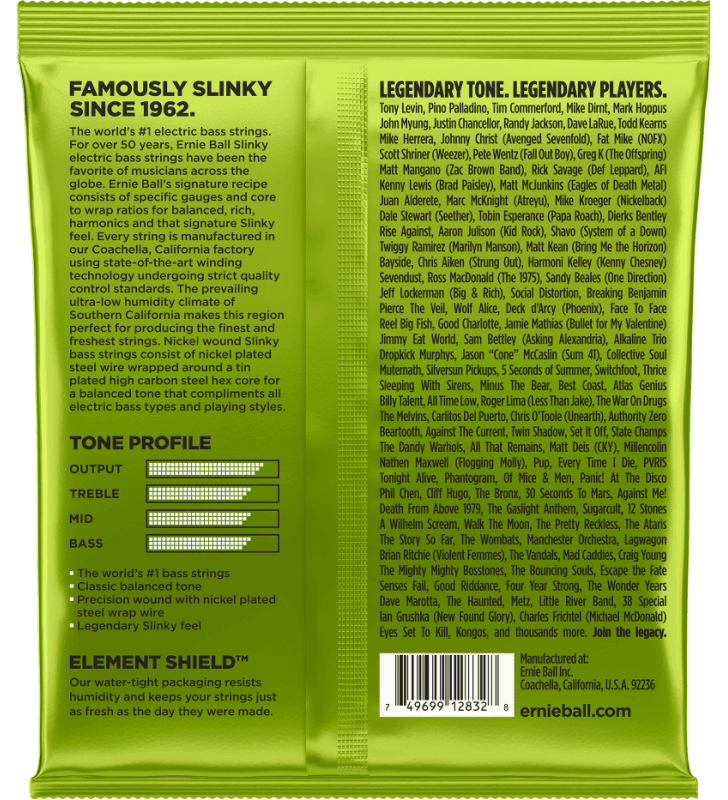 Ernie Ball Nickel Wound Electric Bass Strings zijn gemaakt van vernikkeld staal gewikkeld rond een zeshoekige stalen kerndraad. Elke basgitaarsnaar produceert een heldere, gebalanceerde toon en is vervaardigd met de beste en meest verse grondstoffen in de prachtige Coachella Valley in Zuid-Californië. Diktes .050, .070, .085, .105