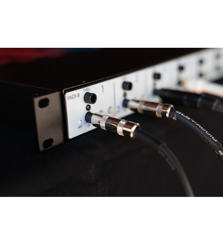 Fantoomvoeding: Elk van de acht kanalen van de RNDI-8 wordt gevoed door standaard 48V fantoomvoeding. De voeding wordt aangegeven door blauwe leds op het voorpaneel, één per kanaal.
