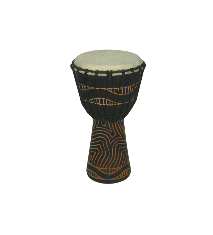 Djembe gemaakt van een bamboe-net met een coating van gebakken hout.