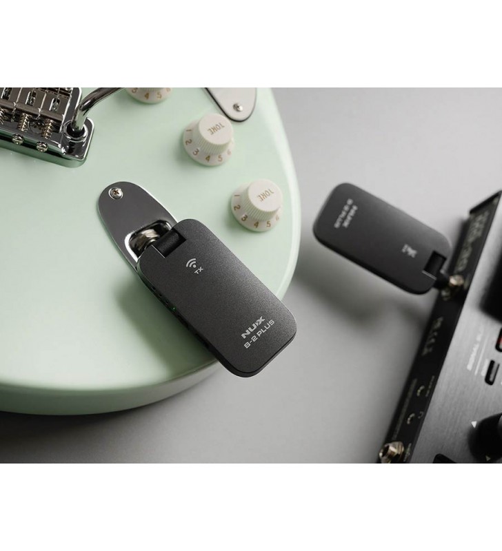 NUX B-2 PLUS biedt 24-bit/44,1 KHz high-definition audiokwaliteit en heeft een vergelijkbaar werkbereik van 60 voet (line-of-site) met minder dan 5 ms latentie.