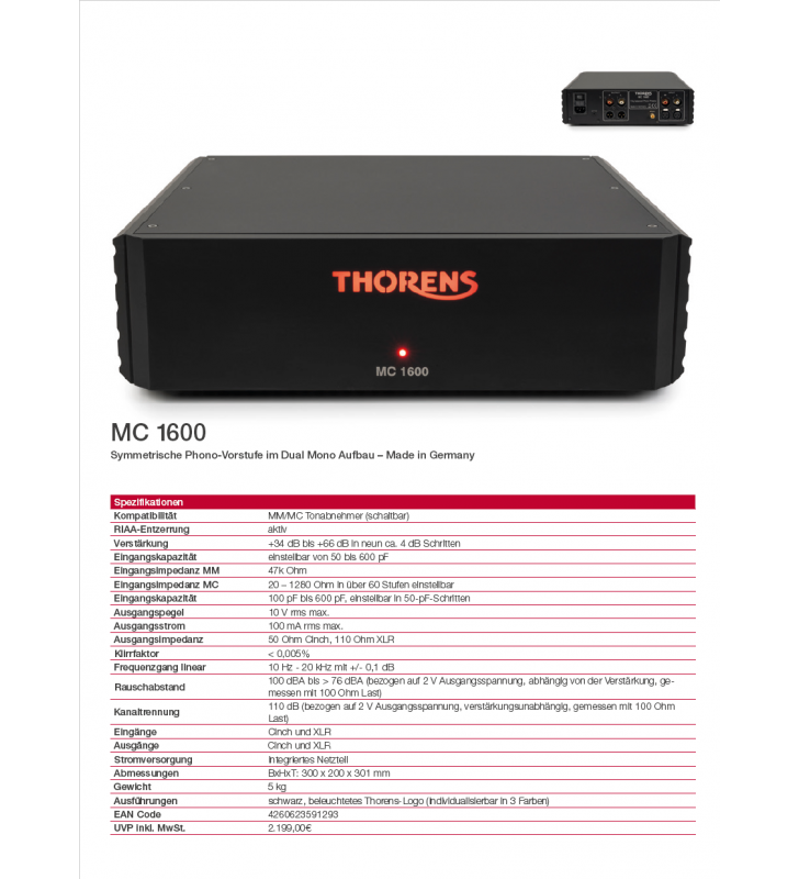 Met de MC 1600 phono voorversterker is Thorens een langgekoesterde wens van veel analoge muziekliefhebbers.