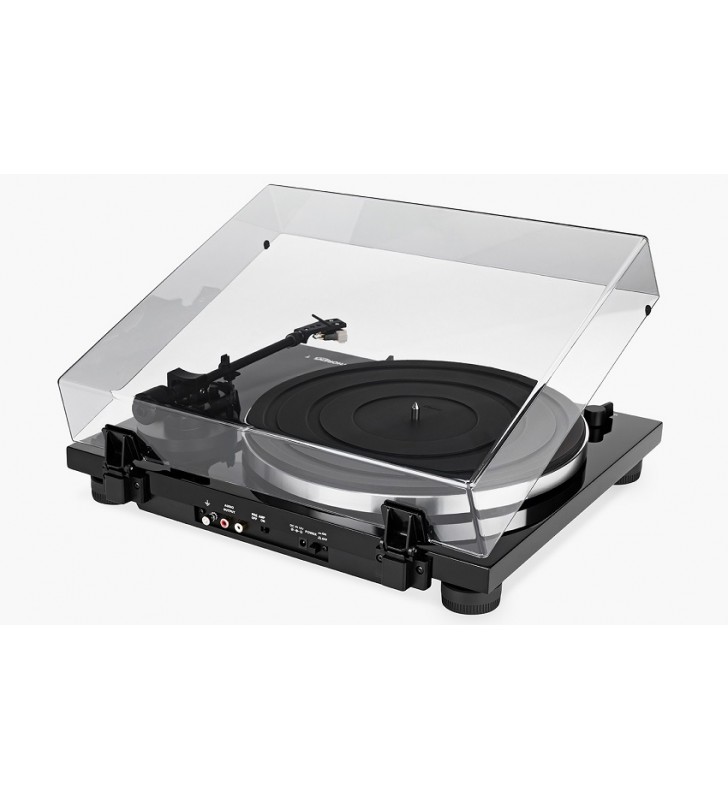 Een snaaraangedreven aluminium draaiplateau met een dikke platenmat zorgen voor een exact toerental, dat u met een druk op de toets op de plint kunt wijzigen van of naar 33 1/3 en 45 toeren.