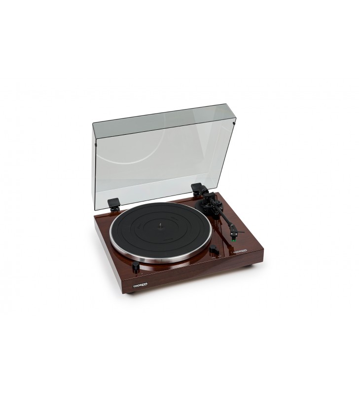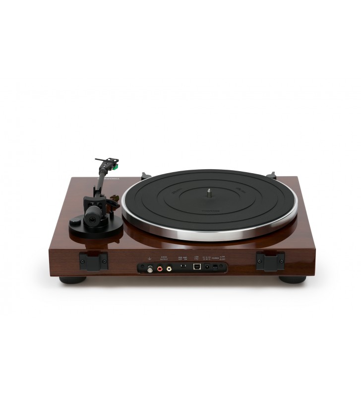 Een snaaraangedreven aluminium draaiplateau met een dikke platenmat zorgen voor een exact toerental, dat u met een druk op de toets op de luxe plint kunt wijzigen van of naar 33 1/3 en 45 toeren.