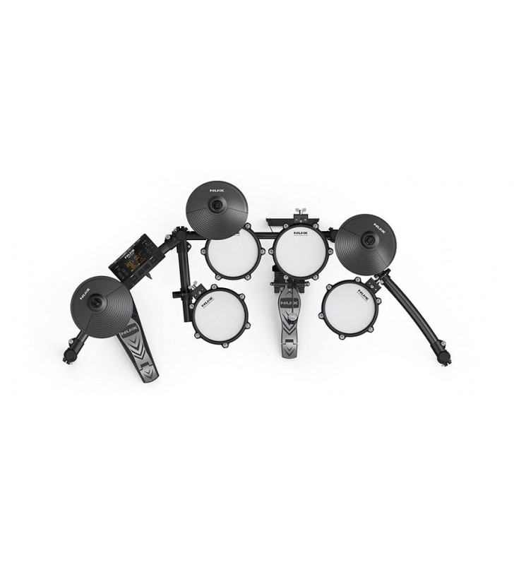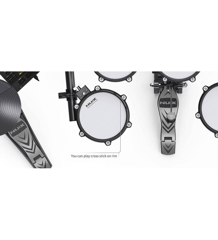 De NUX DM210 is compleet uitgerust met gaasvellen voor een realistische feel. Deze zijn ook naar smaak af te stellen. De kit bevat een losse pad voor de kickdrum, zodat je met een echt bassdrumpedaal aan de slag gaat voor een nog realistischere ervaring.