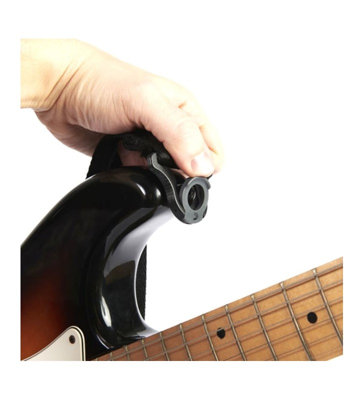 Schuif eenvoudig het uiteinde van de riem over de knoppen van de gitaarriem en u zit vast - zo eenvoudig is het.