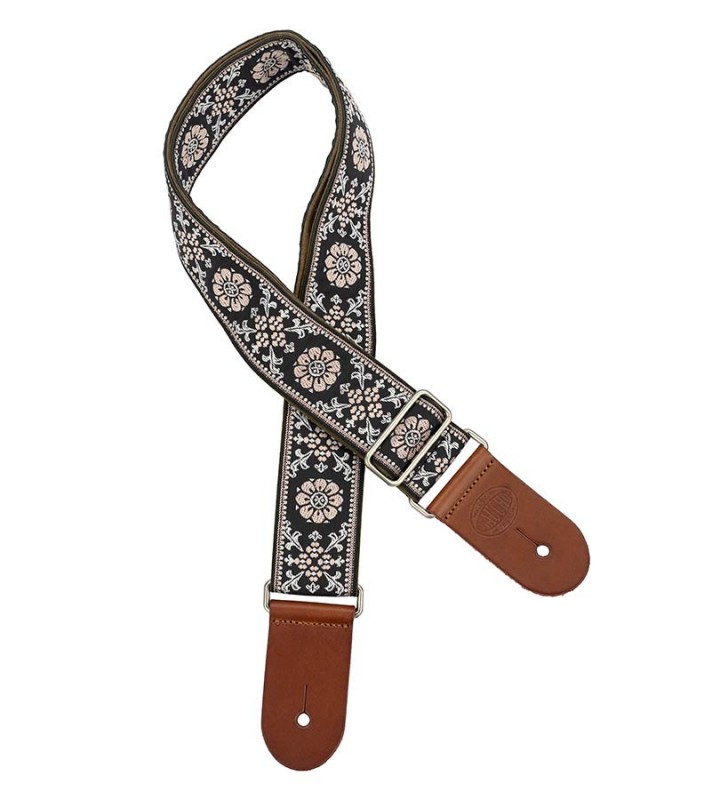 Gitaarband, 2” jacquard geweven, bruine leren slips, bruine leren achterkant, wit/zwart