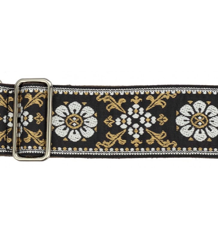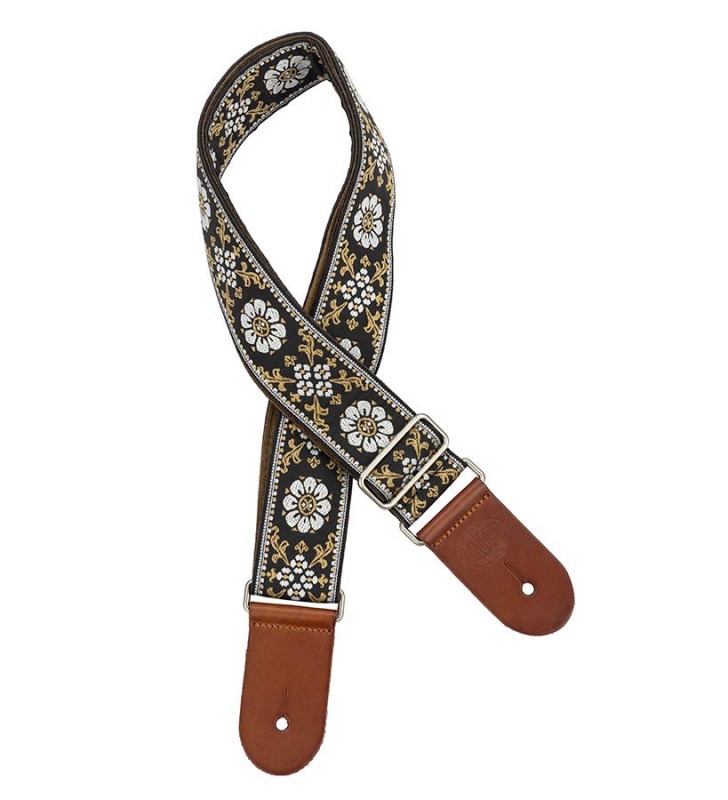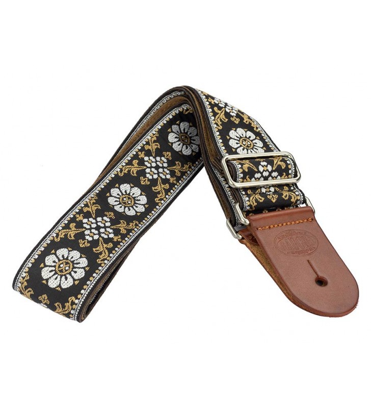 Gitaarband, 2” jacquard geweven, bruine leren slips, bruine leren achterkant, bruin/goud