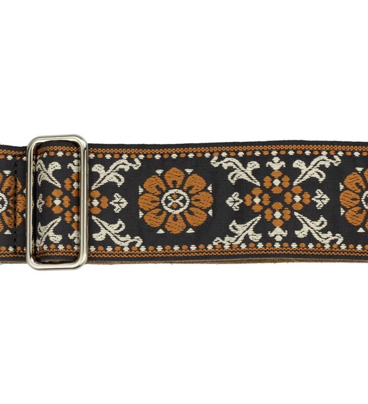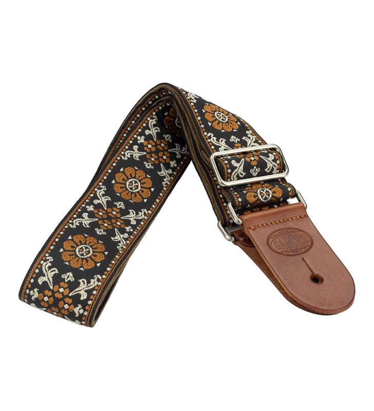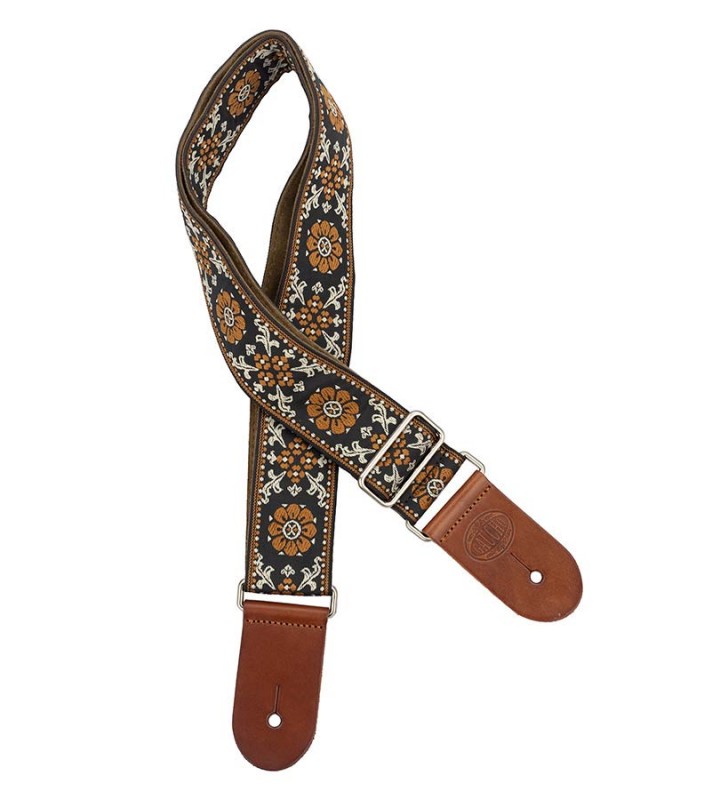 Gitaarband, 2” jacquard geweven, bruine leren slips, bruine leren achterkant, bruin/goud