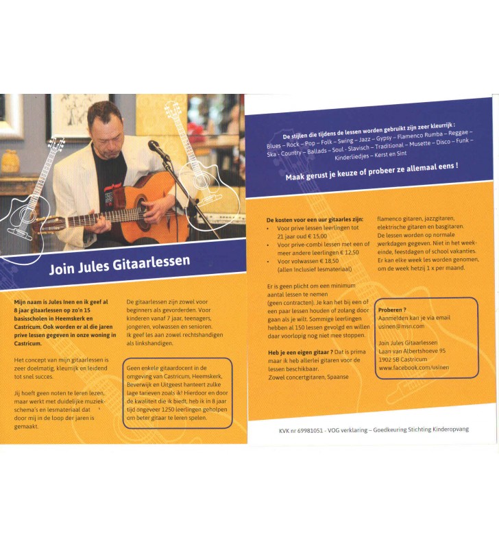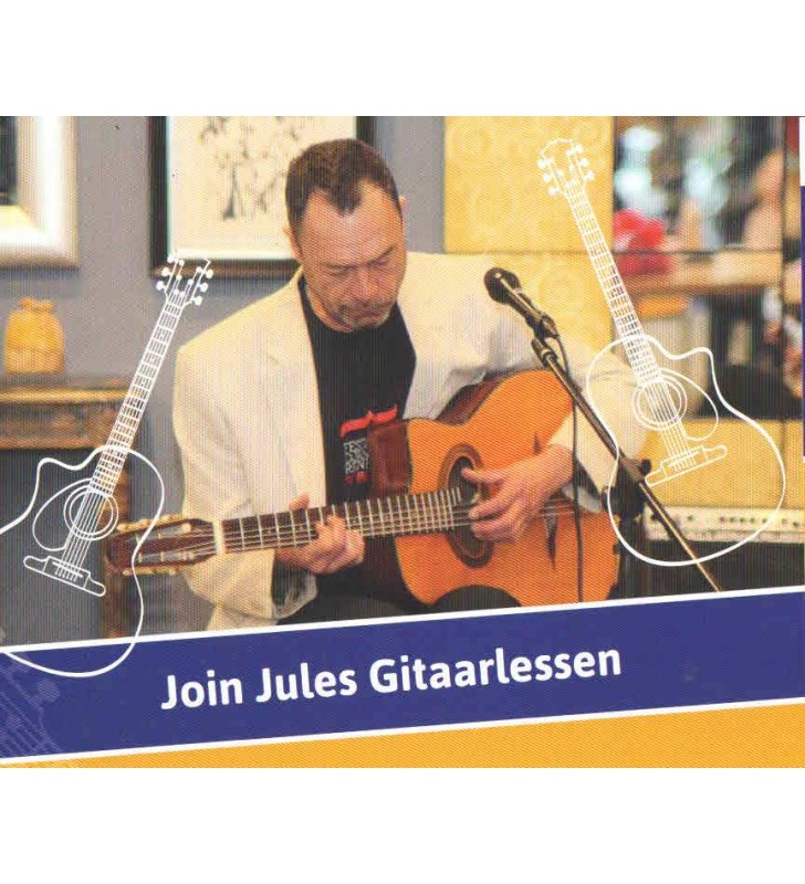 Mijn naam is Jules Inen en ik geef al 8 jaar gitaarlessen op zo'n 15 basisscholen in Heemskerk en Castricum. Ook worden er al die jaren prive lessen gegeven in onze woning in Castricum.
