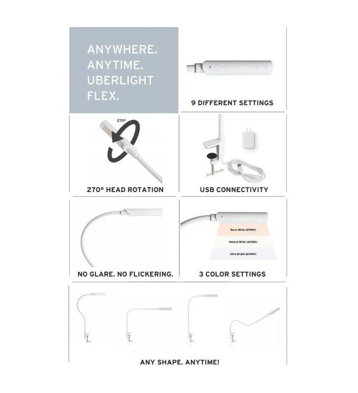 Zo kan het LED hoofd maar liefst 270° gedraaid en maakt de siliconen gooseneck of zwanenhals constructie van 67 centimeter dat de UberLight Flex zich in iedere gewenste positie laat buigen.