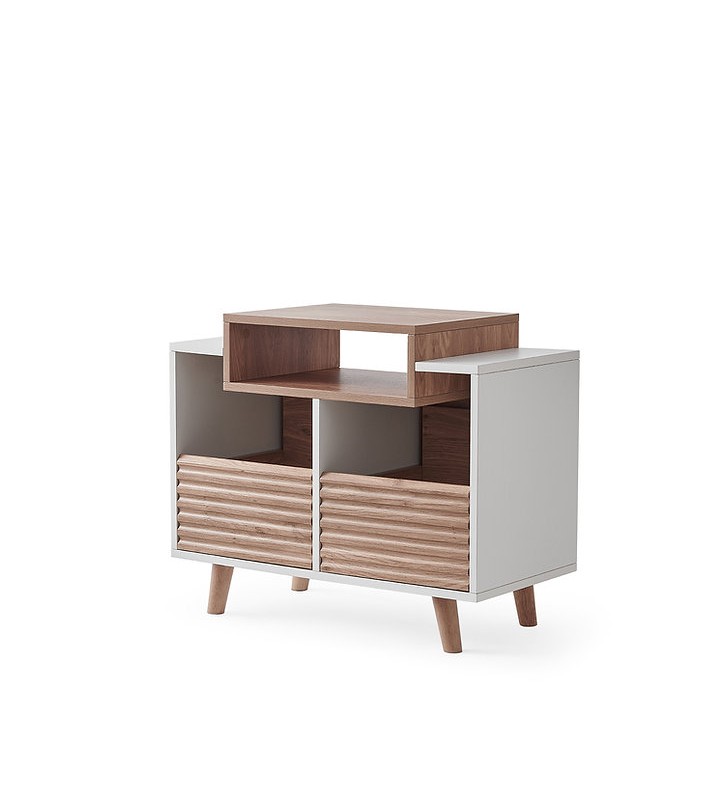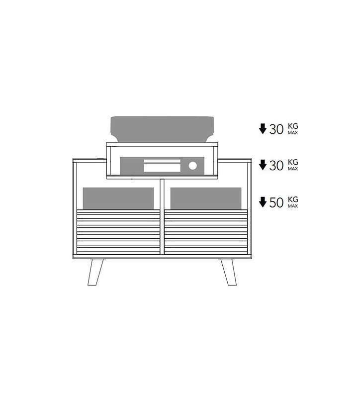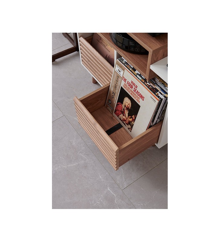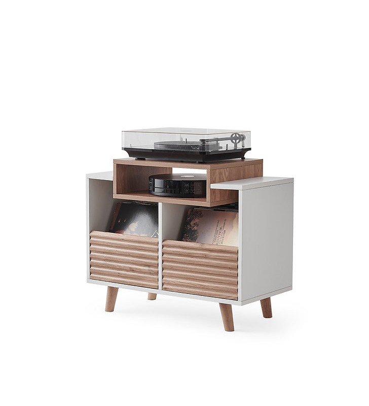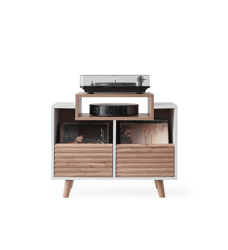 Het bovenoppervlak is ontworpen om een vinyldraaitafel te herbergen, waardoor dit alles-in-één meubelstuk de perfecte aanvulling is.