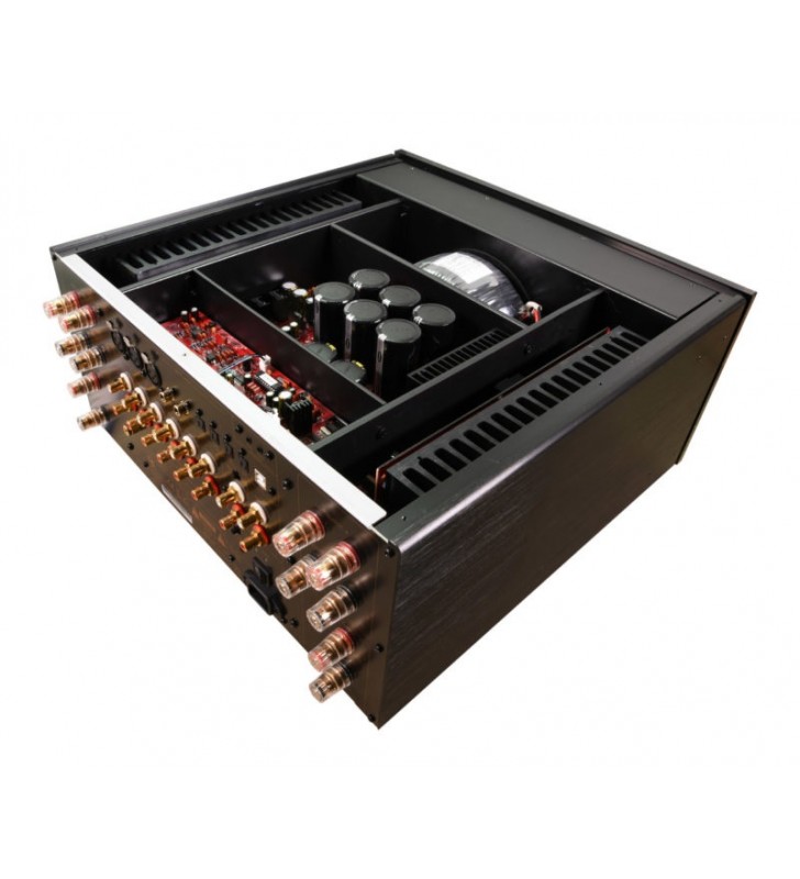 Om te beginnen levert hij een werkelijk enorm vermogen van 400W per kanaal aan 4 Ohm (220W aan 8 Ohm) en ook is hij voorzien van een uitermate stabiele voeding met een zware ringkerntrafo van 700VA en maar liefst 60.000μF aan filtercapaciteit.