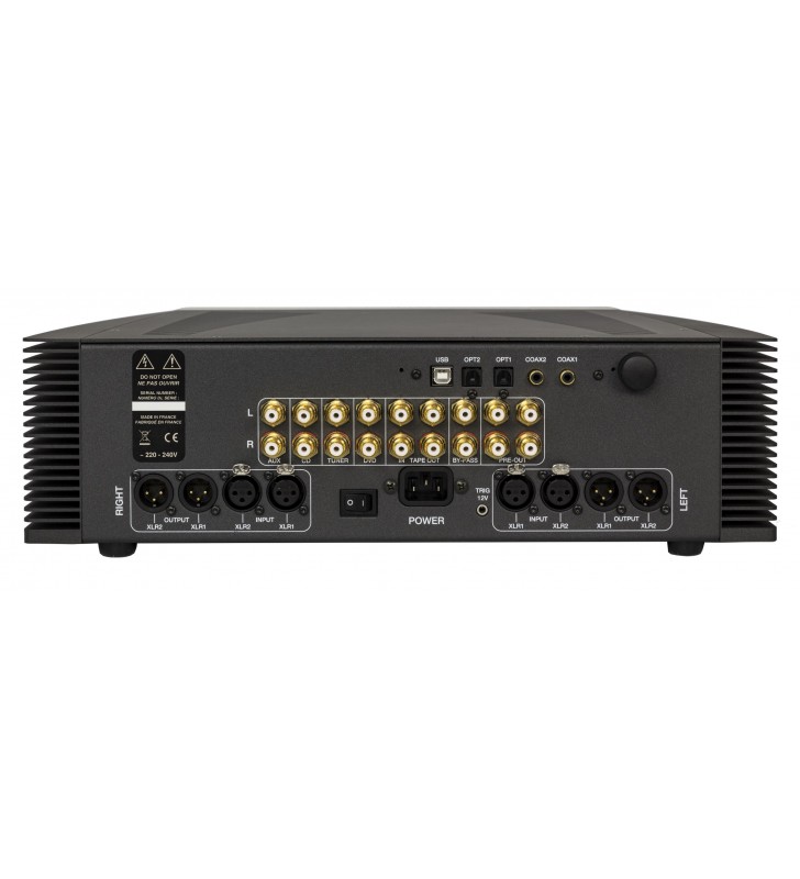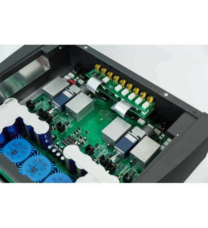 De Atoll PR400 Signature werkt in dubbel mono, beide kanalen hebben één geluidsarme transformator per kanaal.