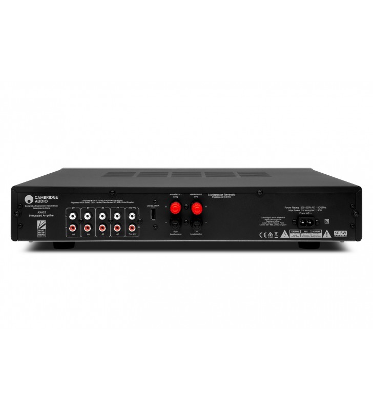 De Cambridge Audio AX-A25 heeft maar liefst 4 paar RCA-ingangen, een paar opname-uitgangen en een USB-aansluiting aan de achterkant voor technische upgrades.