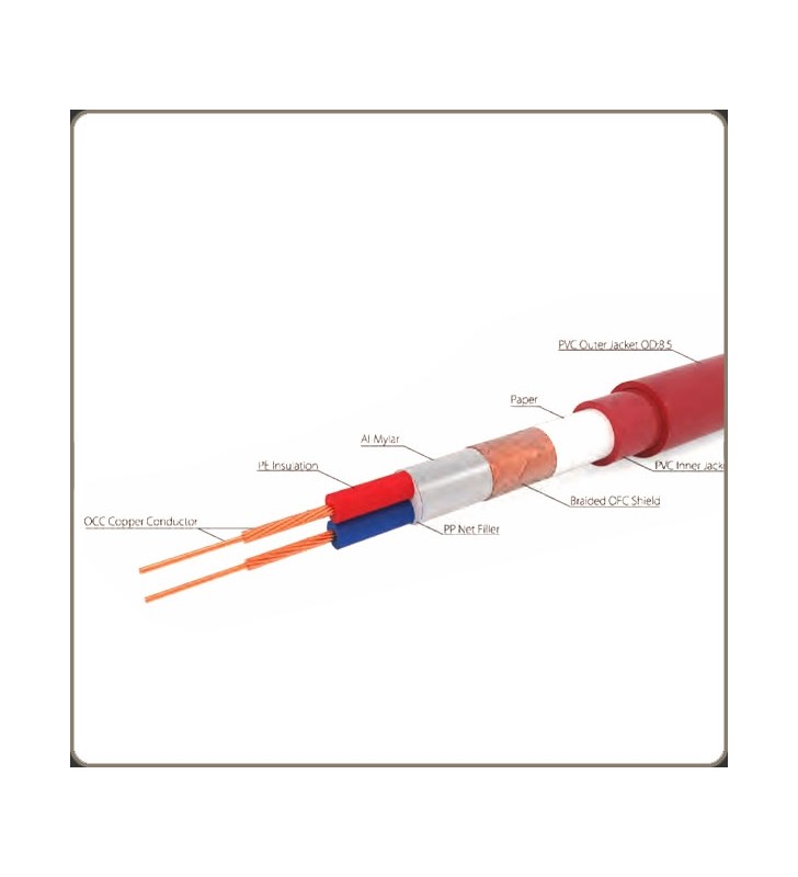 De geleiders worden dubbel en volledig (100%) afgeschermd door een gevlochten UP-OFC koper mantel in een met aluminium opgedampte Mylar folie.