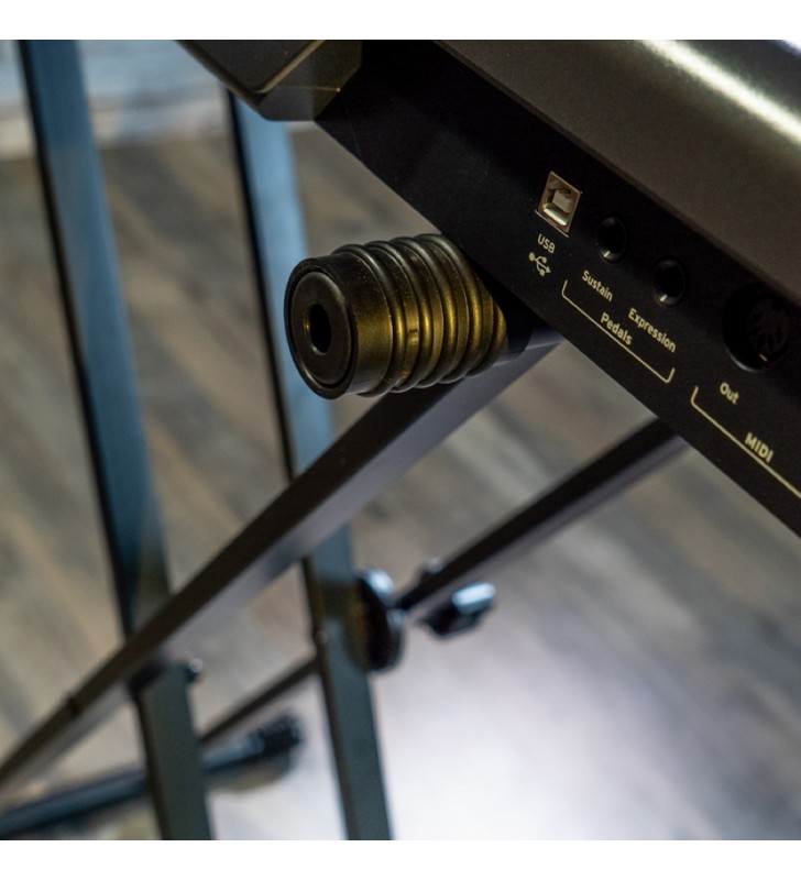 Uitgerust met zelfnivellerende rubberen voetjes en keybordpads om oneffen vloeren en keyboards te compenseren, voor comfortabel, wiebelvrij spelen.