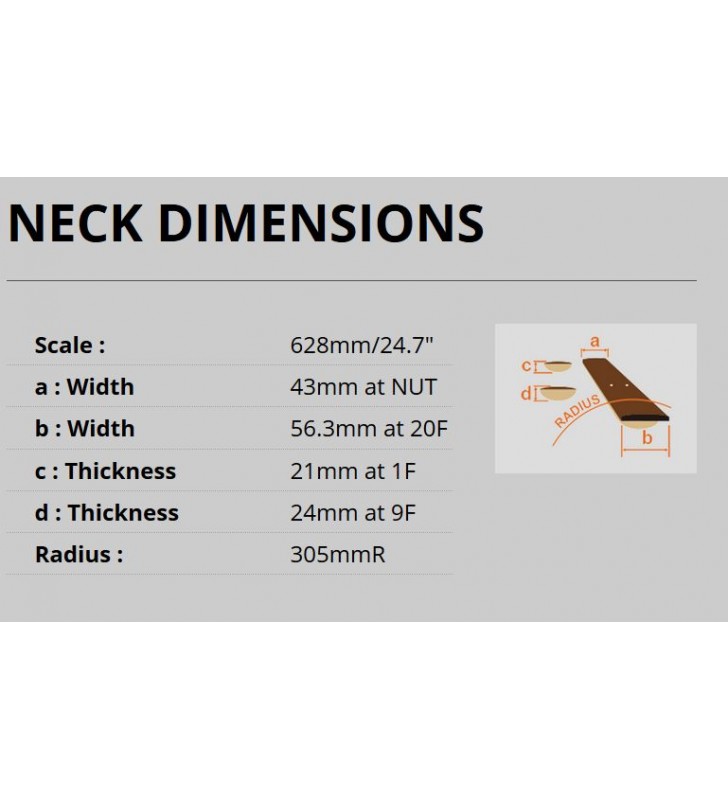 De hals is voorzien van een 20-fret gebonden Laurel toets met witte stippen inleg en chromen stemmechanieken.