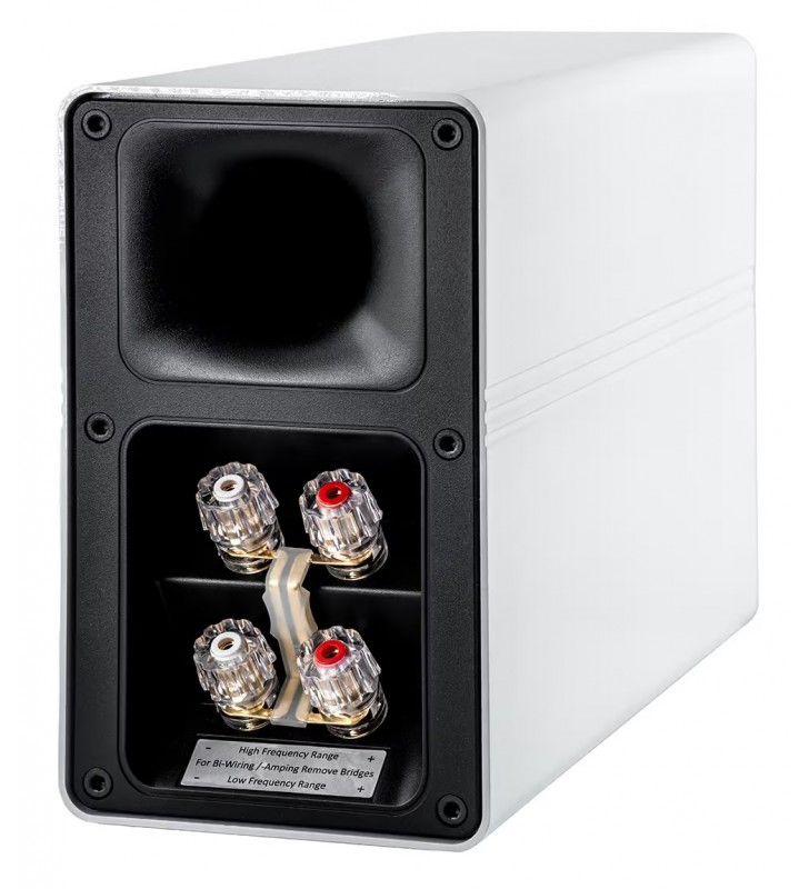 Aan de achterzijde zijn de bas reflexpijp en -opening opnieuw geoptimaliseerd en bevinden zich stevige bi-wiring aansluitterminals.