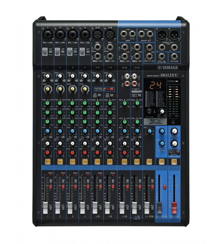 12-Kanalen Mixing Console: Max. 6 Mic / 12 Line Inputs (4 mono + 4 stereo) / 2 GROUP Buses + 1 Stereo Bus / 2 AUX (incl. FX)