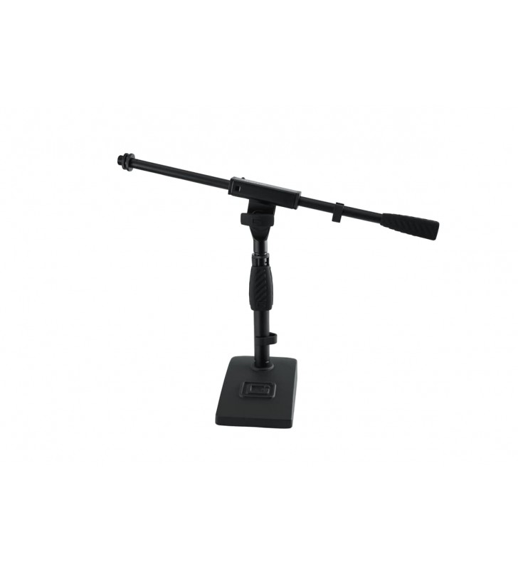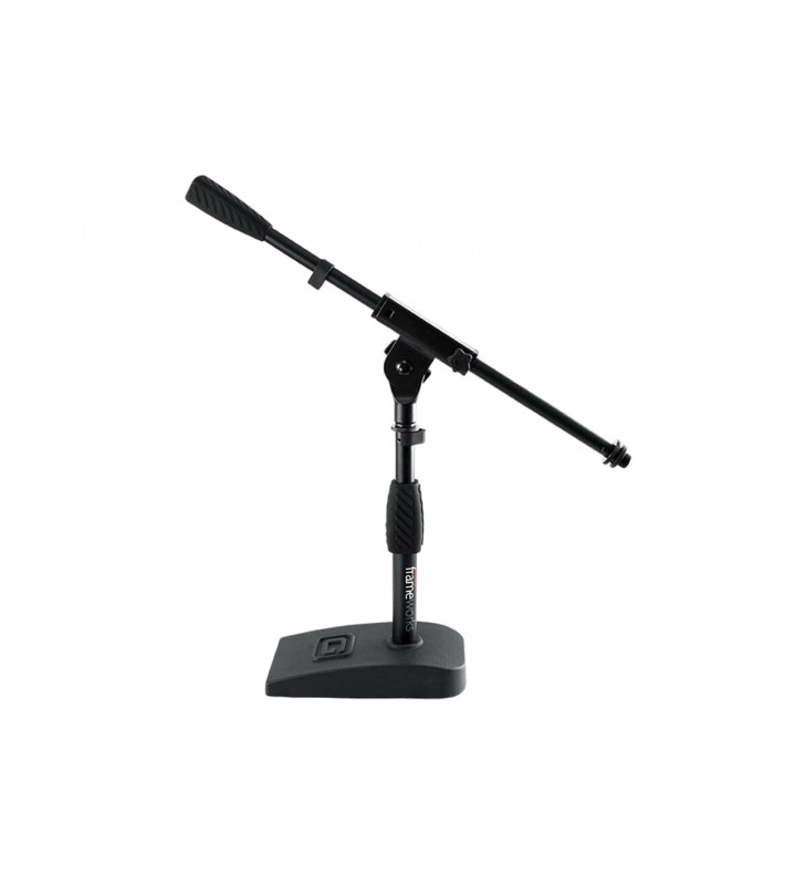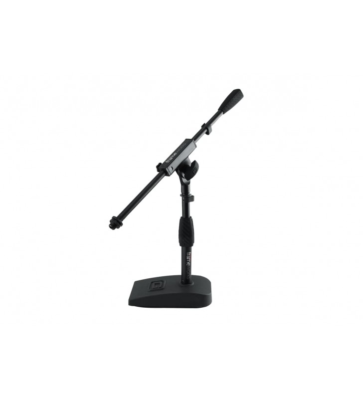 Microfoon microfoonstandaard met laag profiel en telescopische arm, ontworpen voor basdrums en akoestische instrumenten. Zware gietijzeren ronde basis, met anti-vibratierubber voor geluidsfiltering.