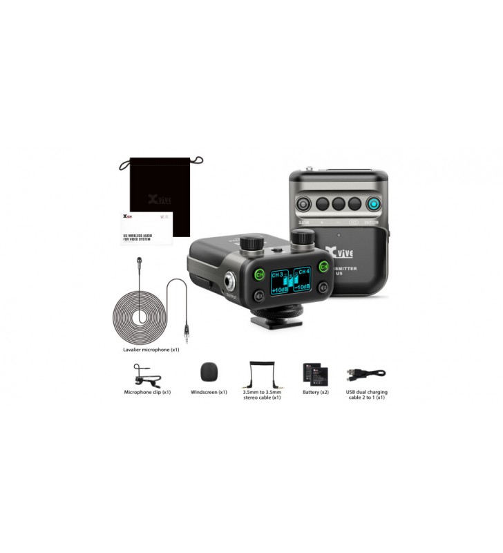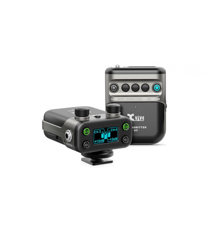 Het systeem werkt met de 2.4 GHz ISM open band en kan over de hele wereld, zonder restricties gebruikt worden. Het belt-packtype zender werkt met dasspeldmicrofoons (zoals de meegeleverde XVive LV1) of standaard lijningangen. De ontvanger komt met een flitsschoen-adapter, dat op een spiegelreflexcamera kan worden gemonteerd om het signaal van de zender direct naar de camera te krijgen. Natuurlijk kan de ontvanger ook apart en zonder camera gebruikt worden, met bijvoorbeeld voice recorders of mobiele opnameapparatuur. De XVive U5 Wireless Audio System werkt voor allerlei soorten toepassingen, zoals video-opnames, persoonlijke uitzendingen, straatinterviews, sportevenementen, concerten, toespraken, etc. waar draadloze verzending nodig is. De U5 Set heeft een transmitter, een ontvanger, dasspeldmicrofoon ene alle benodigde accessoires.