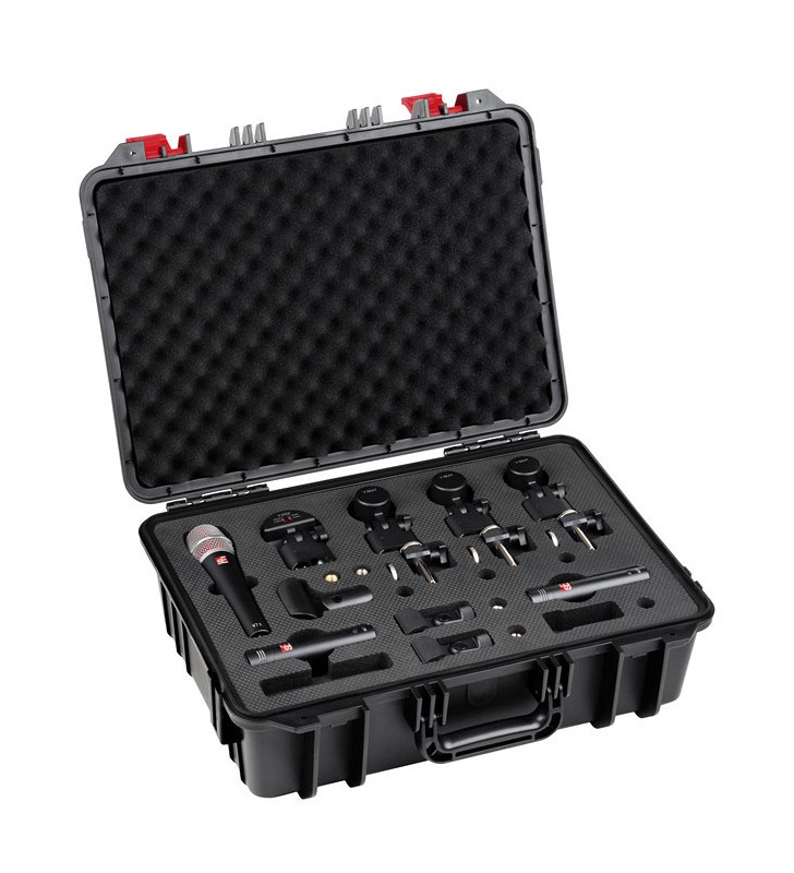 Alle microfoons en accessoires zitten veilig verpakt in een robuuste plastic flightcase, met een lege ruimte inbegrepen voor uw favoriete hi-hat microfoon.