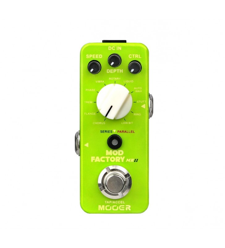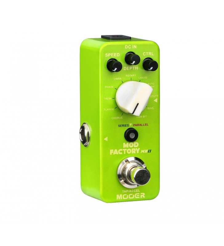 Om de ervaring nog verder te verbeteren, zijn realtime taptempo- en acceleratiefuncties toegevoegd die toegankelijk zijn via de soft-touch, momentane voetschakelaar. Mod Factory MKII heeft ook een optie voor serie / parallel. De serie- / parallelschakelaar schakelt tussen seriële en parallelle interne signaalketenroutering. Dit levert effectief 2 zeer verschillende geluiden op van elk modulatietype.