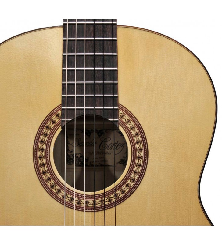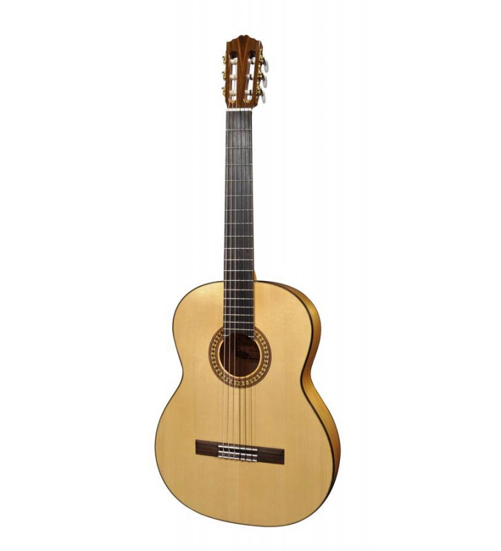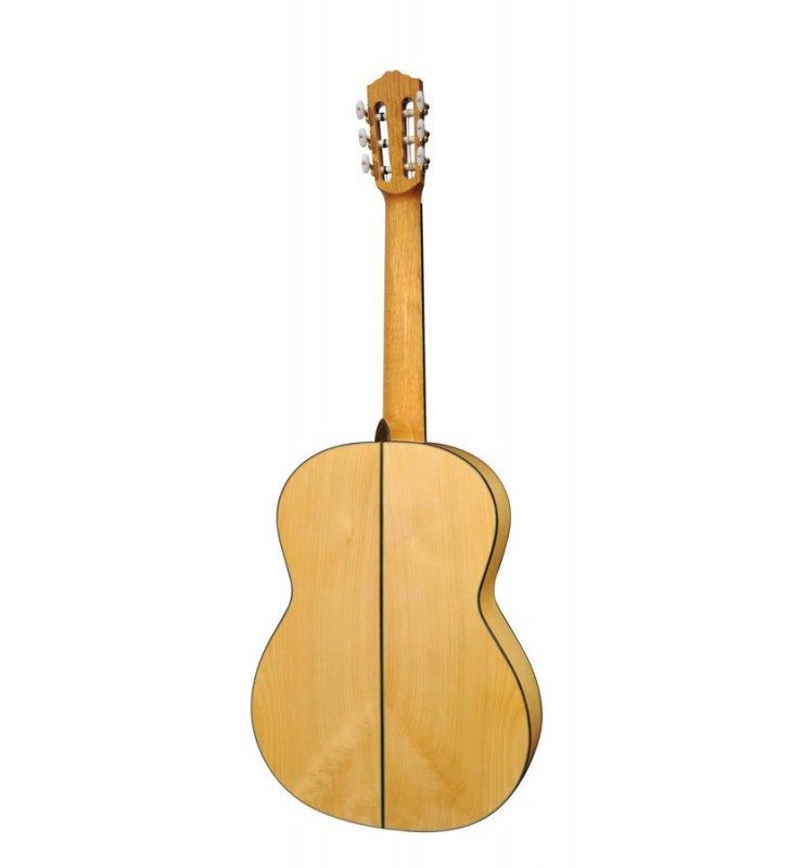 flamenco gitaar, massief spruce top, massief cypress b&s, luxe koffer, 650mm De Salvador Cortez CF-120 is een zeer fraai afgewerkte Flamenco gitaar met een massief sparren bovenblad en eveneens massief cypress zij- en achterblad. Deze all-solid constructie zorgt voor het warme, heldere, directe en strakke geluid wat vereist is voor de temperamentvolle, vaak staccato manier van spelen die bij Flamenco hoort.