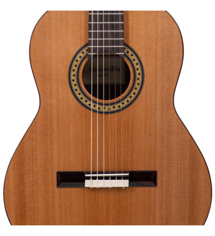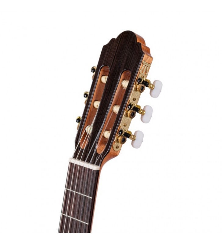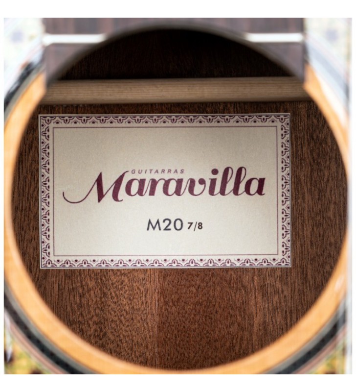 De Maravilla M20 7/8 is het zogenaamde "Señorita model" binnen onze M20-lijn Spaanse gitaren. Speciaal ontworpen voor de serieuze student met kleinere handen geeft dit instrument net wat meer speelgemak. De mensuur is 630 mm en een nekbreedte aan de topkam 50 mm. Voor het bovenblad is een mooi stuk Western Red Cedar gekozen. Zij- en achterkant zijn gemaakt van gelamineerd sapele. De M20 7/8 valt op door mooie handgemaakte elementen zoals een uit hout vervaardigde rozet, stootranden van Indisch pallisander en benen topkam & brugzadel. De prachtige hoogglans finish geeft deze M20 7/8 een professionele look. Net zoals bij de andere Maravilla gitaren, is ook de nek van M20 7/8 voorzien van een lichtgewicht trussrod. Hiermee kun je gemakkelijk de actie van de gitaar instellen. Ook wordt de stabiliteit van de nek ermee vegroot. De M20 7/8 komt standaard met een luxe gigbag.