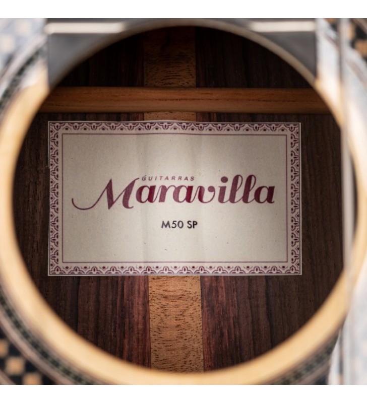 De M50 is Maravilla’s best verkochte Crossover-gitaar. Het instrument kent twee uitvoeringen, met een massief Canadees ceder bovenblad (M50 CD) of Europees sparren (M50 SP) bovenblad. Zij- en achterkant zijn van palissander. Het belangrijkste kenmerk van dit model is het slanke halsprofiel: 48 mm topkambreedte, 16" toetsradius, met 12 frets tot aan de klankkast. Dit maximaliseert de overdracht van resonantie en trillingen op het boevenblad. De M50 biedt de perfecte mix van een klassiek Spaans ontwerp en moderne looks: een met de hand ingelegde houten rozet, elegante mahoniehouten bindingen en een mooie hoogglans PU finish.