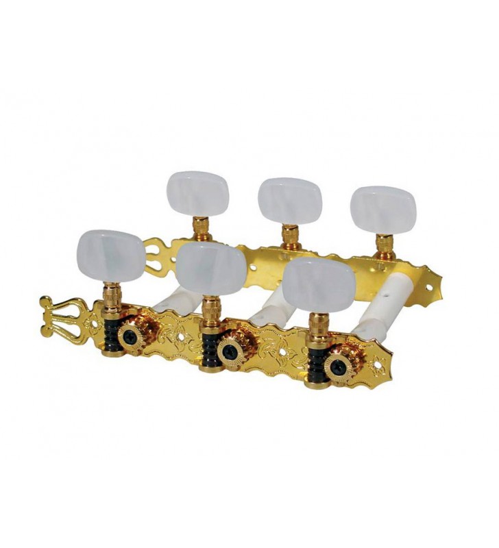 Stemmechanieken voor klassieke gitaar, nylon as, 3x links+3x rechts, 70mm, goud, parelmoer knoppen