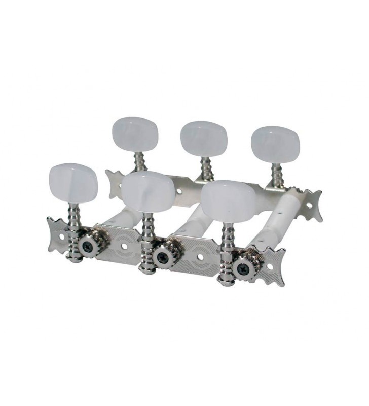 Stemmechanieken voor klassieke gitaar, nylon as, 3x links+3x rechts,70mm, nikkel, parelmoer knoppen