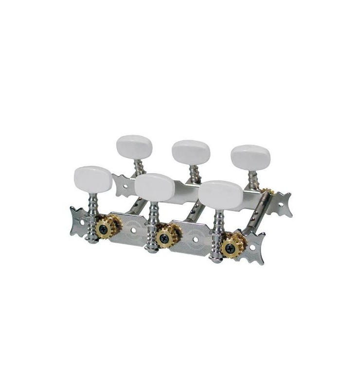 Stemmechanieken voor klassieke gitaar, nylon as, 3x links+3x rechts, 70mm, goud, parelmoer knoppen.