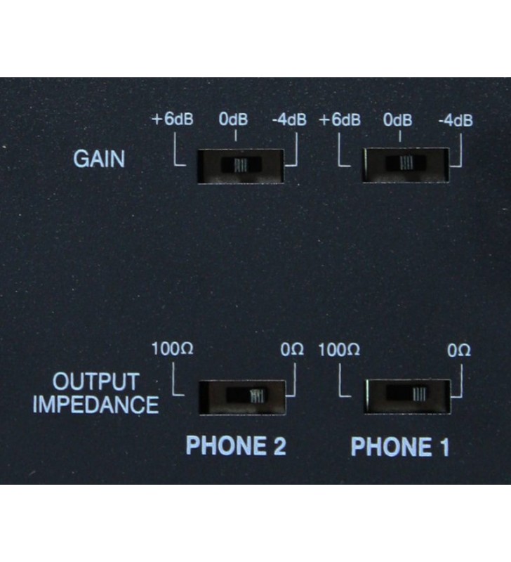 Voor een optimale aanpassing aan uw hoofdtelefoon kan aan de onderzijde van het apparaat per uitgang de uitgangsimpedantie en de versterkingsfactor op twee standen worden ingesteld.