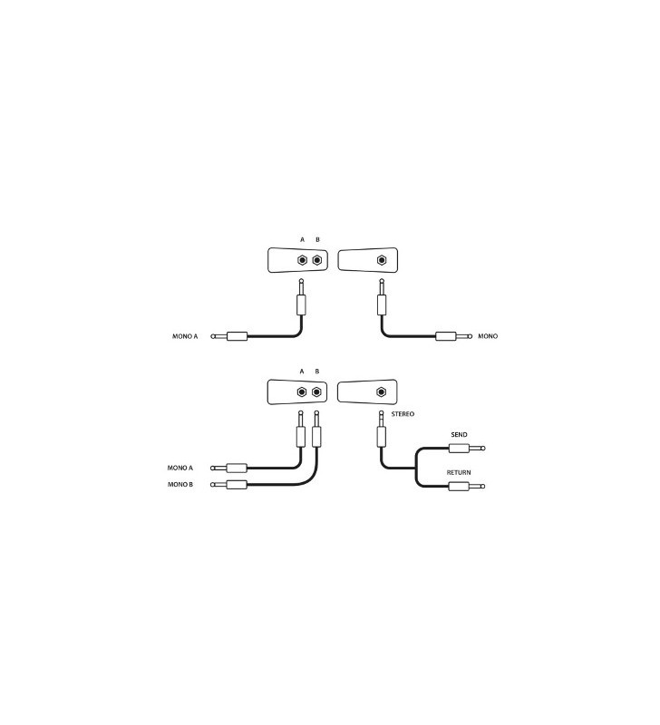 - 1 x 6,3 mm (1/4") TRS aansluiting naar 2 x 6,3 mm (1/4") TRS aansluiting