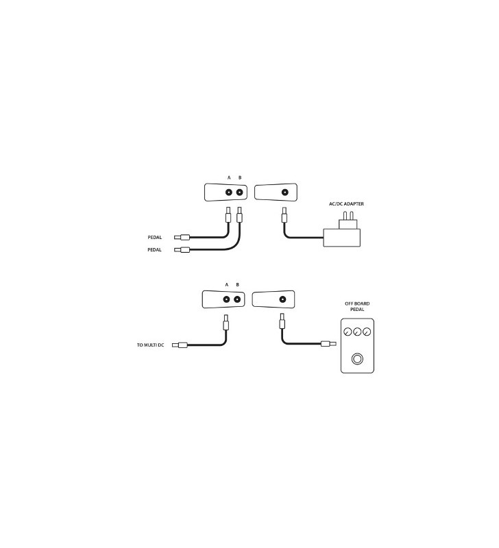 DC-voedingskabels of "daisy chain"-verdelers kunnen worden gebruikt in plaats van een multi-voeding om de stroom naar de pedalen te verdelen. (Uitgangen A en B zijn parallel geschakeld).