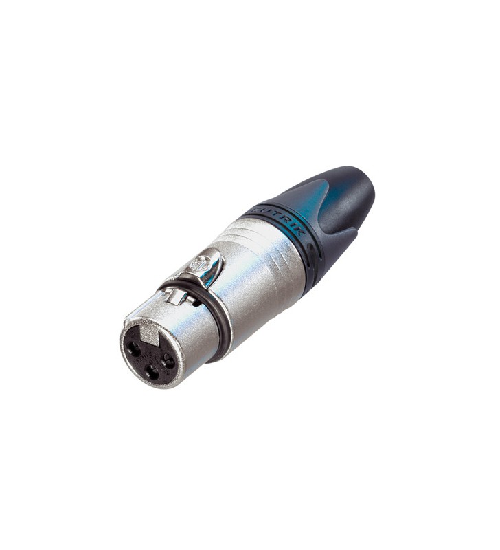 3-polige vrouwelijke kabelconnector met zwarte metalen behuizing en zilveren contacten.