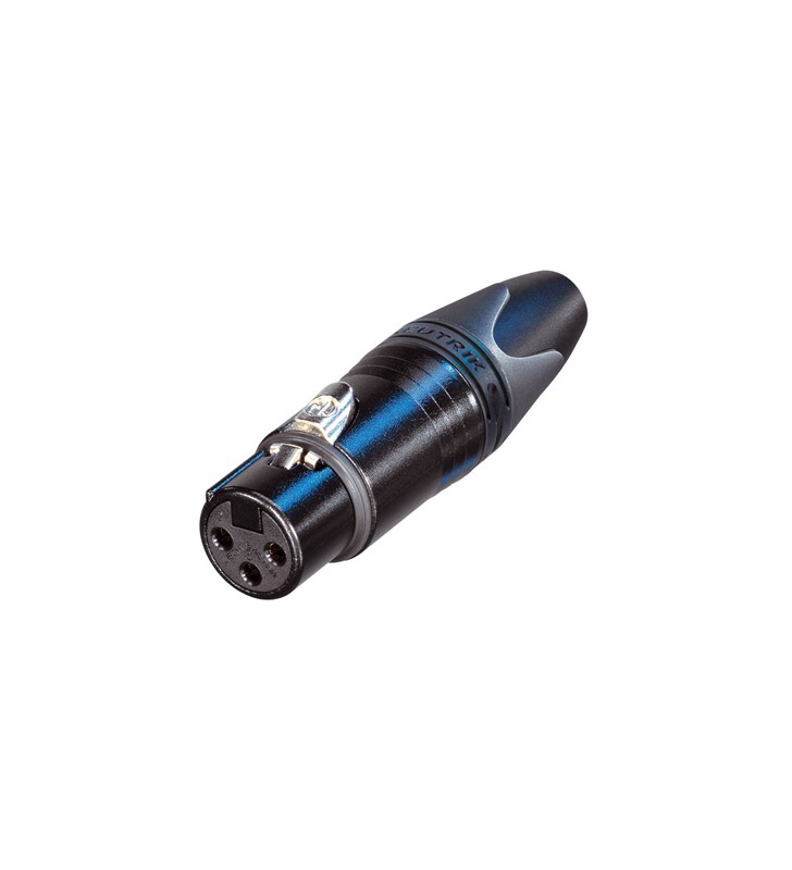 3-polige vrouwelijke kabelconnector met zwarte metalen behuizing en zilveren contacten.