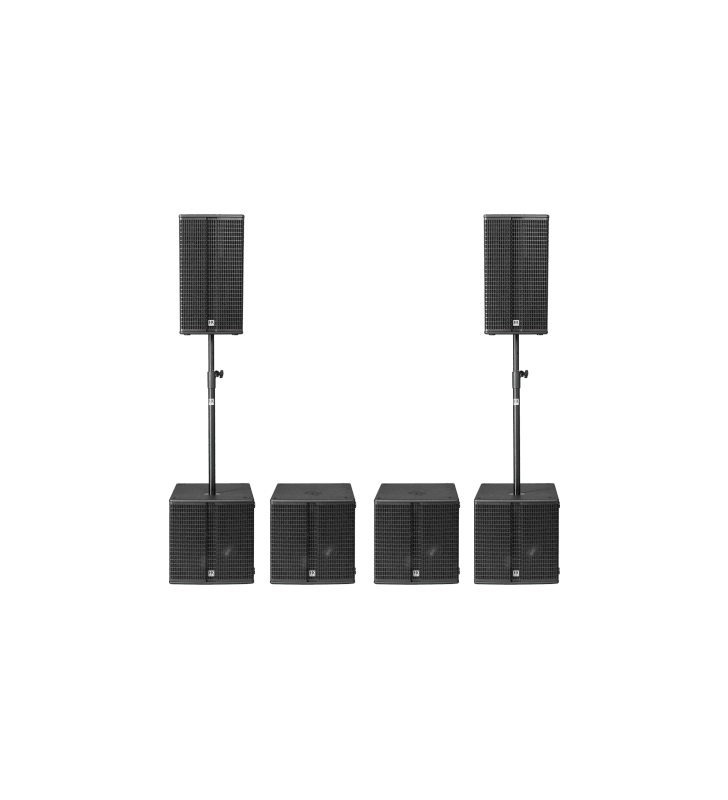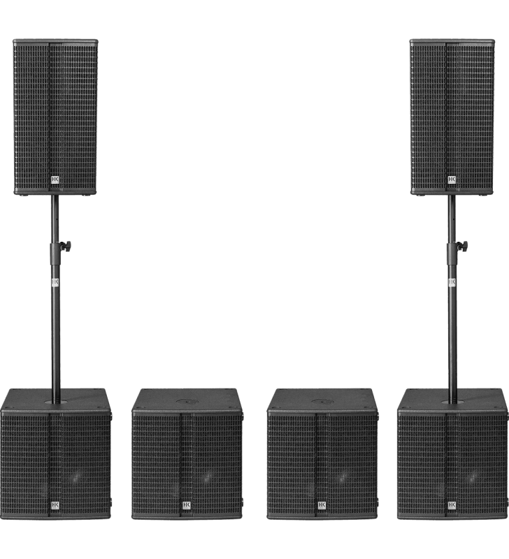 De HK Audio LINEAR 3 High Performance Pack bevat twee LINEAR 3 112 FA-cabines en vier LINEAR Sub 1500 A-subwoofers.