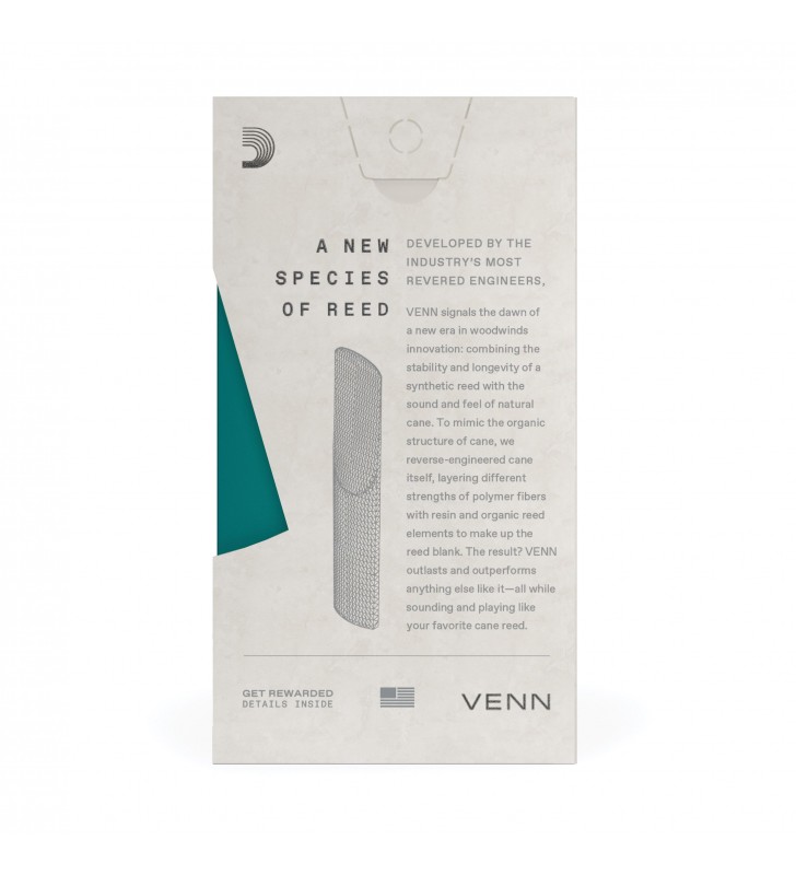 Venn synthetisch riet Bb klarinet 2.5 D'Addario VENN: een geavanceerd synthetisch riet gemaakt van polymeervezels, hars en natuurlijke rietelementen. Ontworpen om spelers de voordelen van synthetische rieten te geven zonder afbreuk te doen aan het geluid en de bespeelbaarheid van rieten.