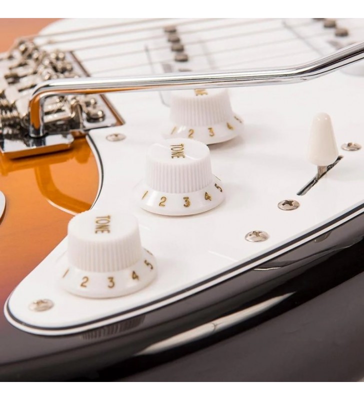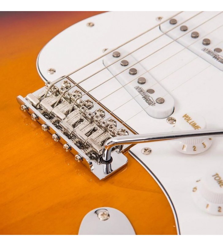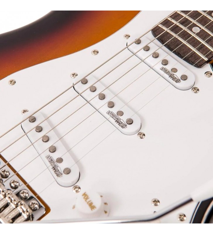 De Vintage V6 Reissued is een klassiek ogende en veelzijdige elektrische gitaar, ontworpen voor gitaristen die op zoek zijn naar authentieke klank, moderne speelbaarheid en betrouwbare bouwkwaliteit. Met zijn iconische Sunburst-afwerking en hoogwaardige componenten biedt deze gitaar een perfecte balans tussen vintage uitstraling en hedendaagse performance.