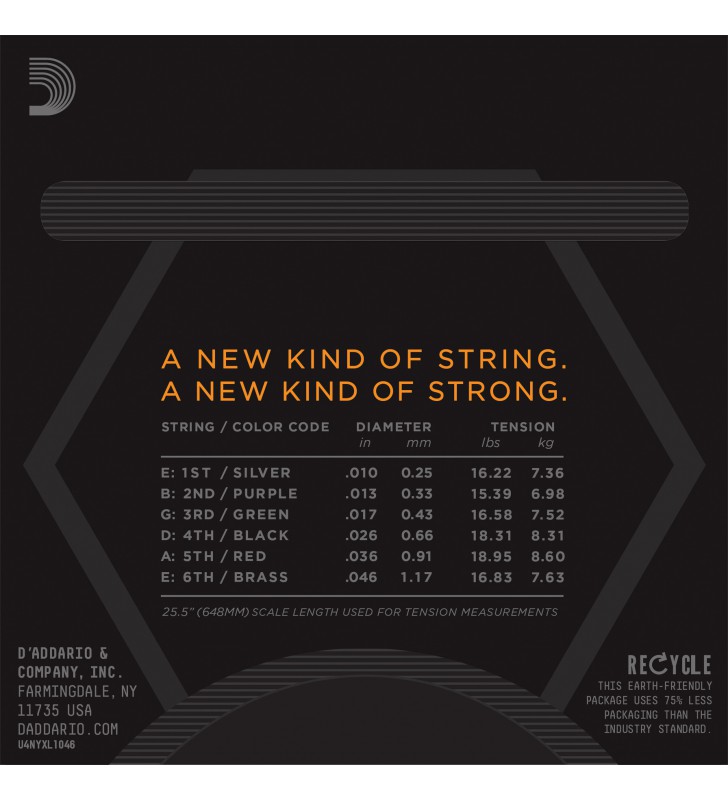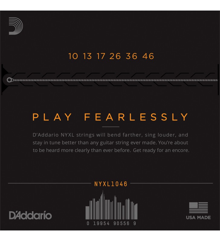 D'Addario NYXL gitaarsnaren benden verder, zingen luider, en  blijven beter op stemming dan elke snaar die je eerder hebt gespeeld!  Ontwikkeld, geperfectioneerd en gefabriceerd door D'Addario in New York, levert de nieuw ontworpen, breukbestendige, stalen kern met een hoog koolstofgehalte en de nieuwe staallegering voor de kale snaren een geheel nieuw niveau van vrijheid, vertrouwen en kracht. NYXL's zijn veel sterker en hebben een 131% hogere stemvastheid door een volledig opnieuw uitgevonden draadtrekproces te gebruiken in combinatie met een revolutionair "fusion twist" -proces voor de onomwonden snaren. De opnieuw geformuleerde, met nikkel beklede snaarwindingen hebben grotere magnetische eigenschappen, wat resulteert in een hogere output en verbeterd midden.